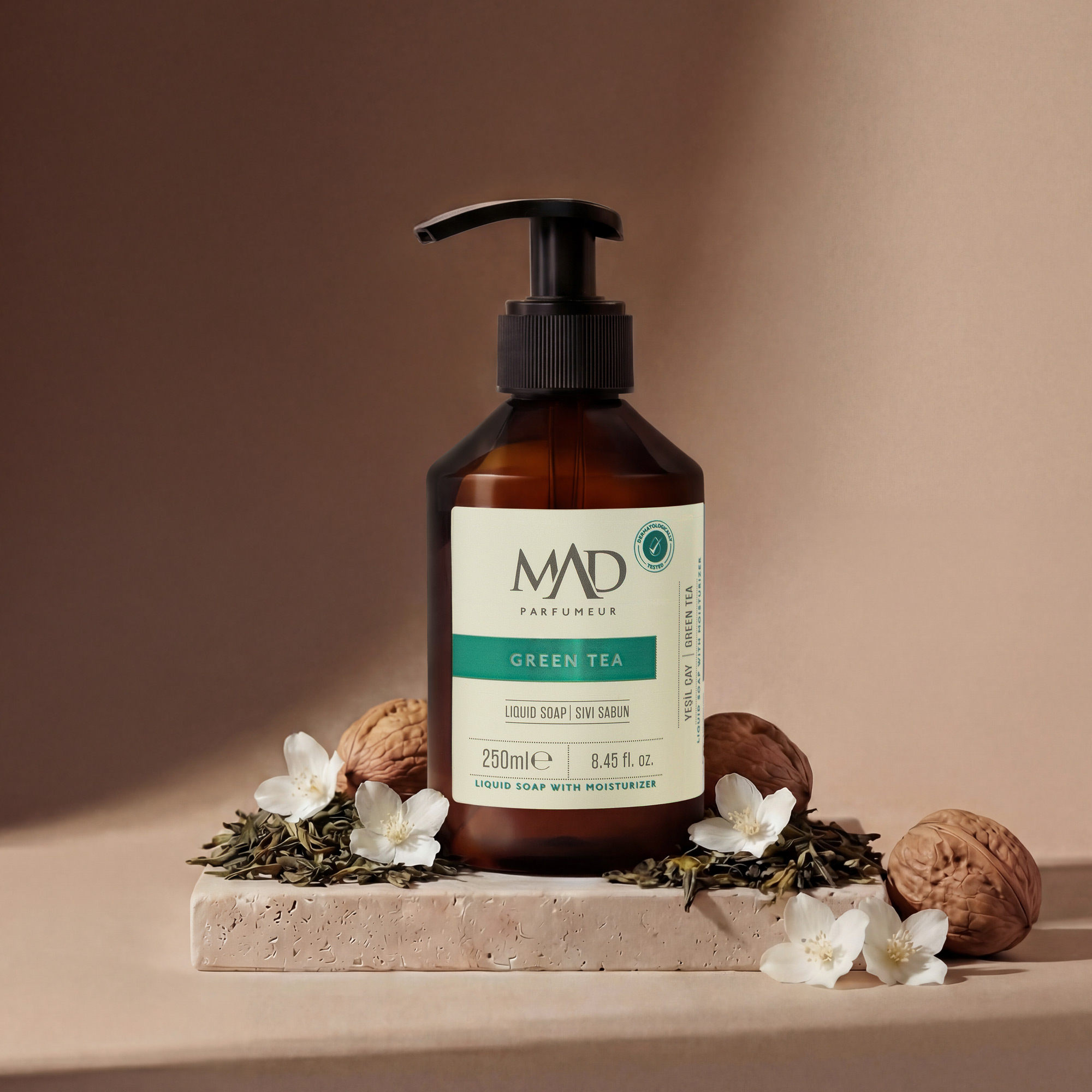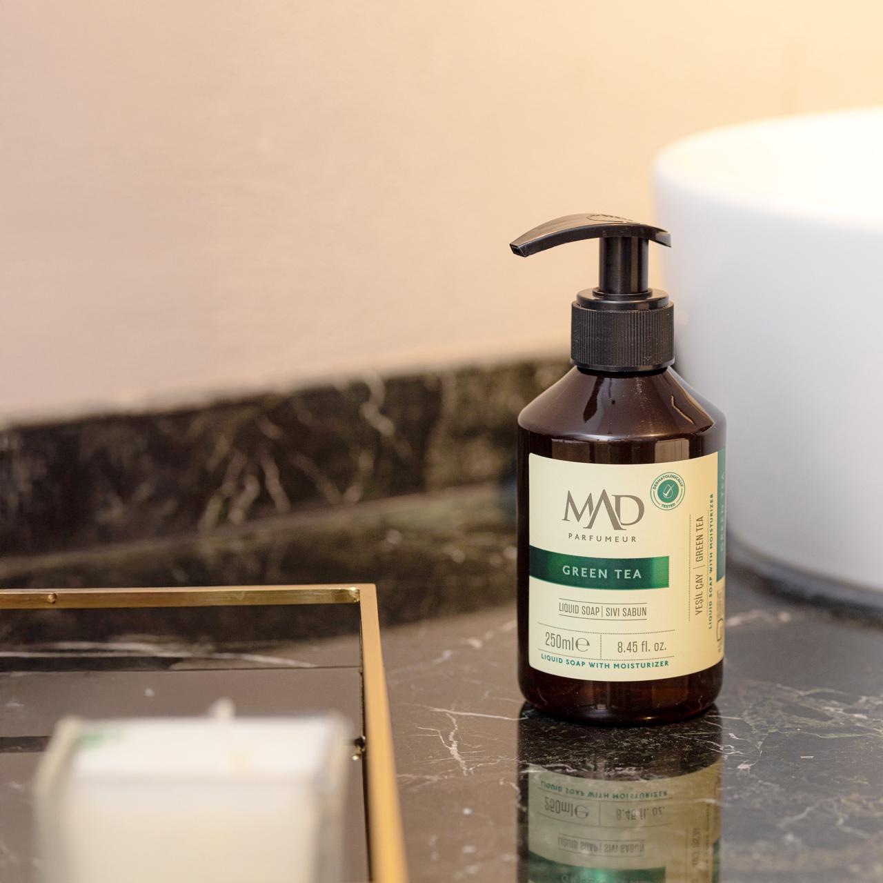 eel the freshness of nature on your skin. MAD Green Tea liquid soap purifies your skin with refreshing mint and bergamot, while the effect of green tea provides vitality. Jasmine, coconut, and musk combine with the soothing touch of green tea to give you a feeling of freshness that lasts all day, leaving you feeling refreshed with every use.